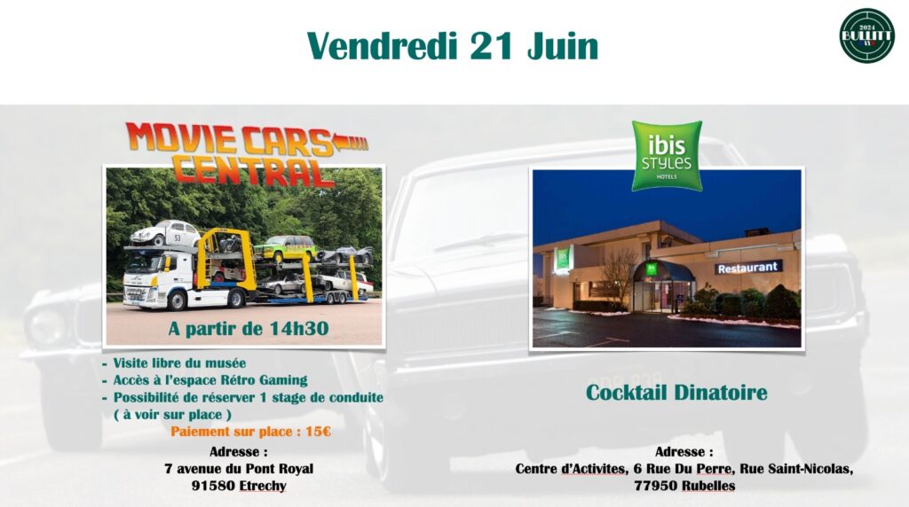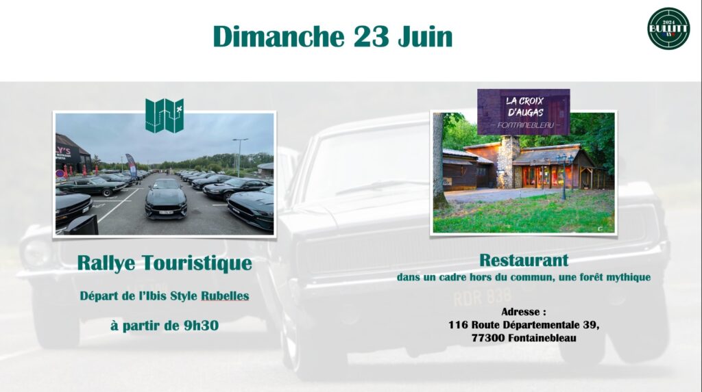 La journée se poursuivra dans une ambiance conviviale autour d’un cocktail dînatoire à l’hôtel Ibis Styles de Rubelles, l’occasion idéale de partager un moment entre passionnés et participants des Bullitt Days.