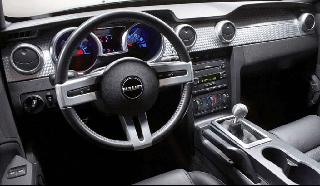 Les sièges sport en cuir noir portent un léger embossage “Bullitt”, les compteurs sont cerclés d’aluminium, et le pommeau de levier de vitesses façon balle de revolver rappelle les années 60.